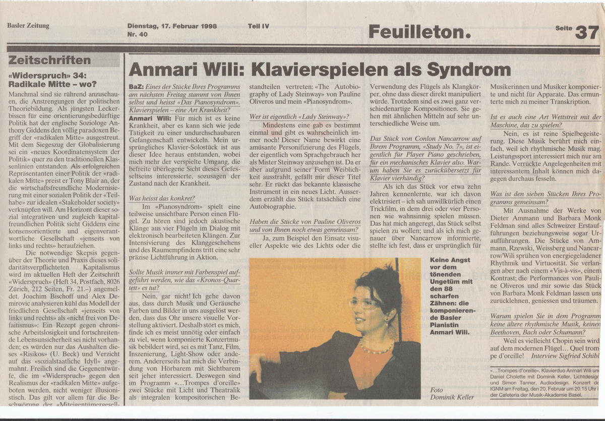 DAS PIANOSYNDROM: für Piano, Zuspielband, Live-Elektronik und Licht; Urauffürung: 20.2.1998 IGNM-Konzert in Musik-Akademie Basel; Anmari Wili & Daniel Cholette: Piano-Duo, Dominik Keller: Licht